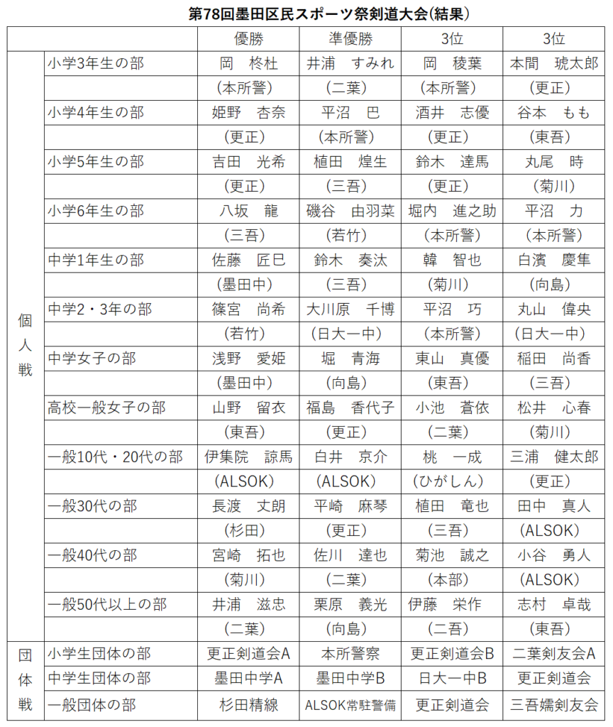 第78回墨田区民スポーツ祭剣道大会(結果)