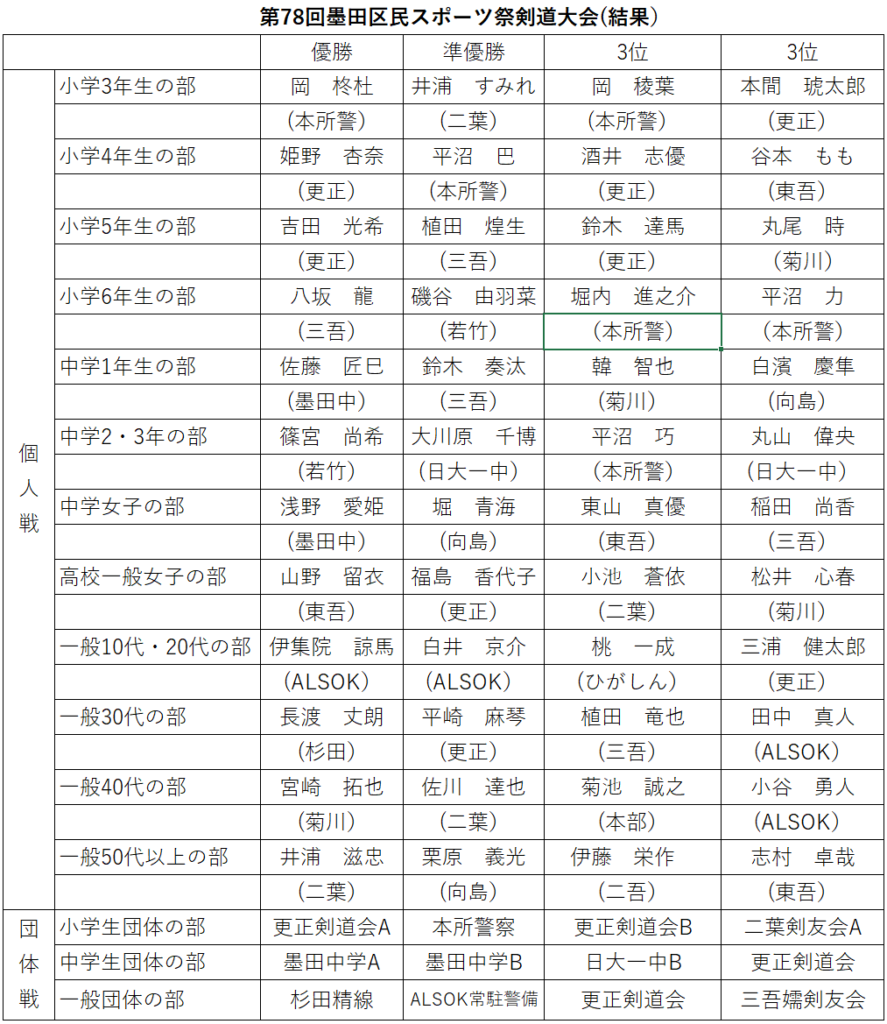 1.主催 墨田区、墨田区教育委員会、墨田区体育協会 2.主管 墨田区剣道連盟 3.日時 令和5年11月19日(日) 午前8時半開場、9時半開会式 4.場所 墨田区総合体育館2階武道場 墨田区錦糸4-15-1(錦糸公園内) 5.参加資格 墨田区内に在住、在勤及び区内の学校…[続きを読む]